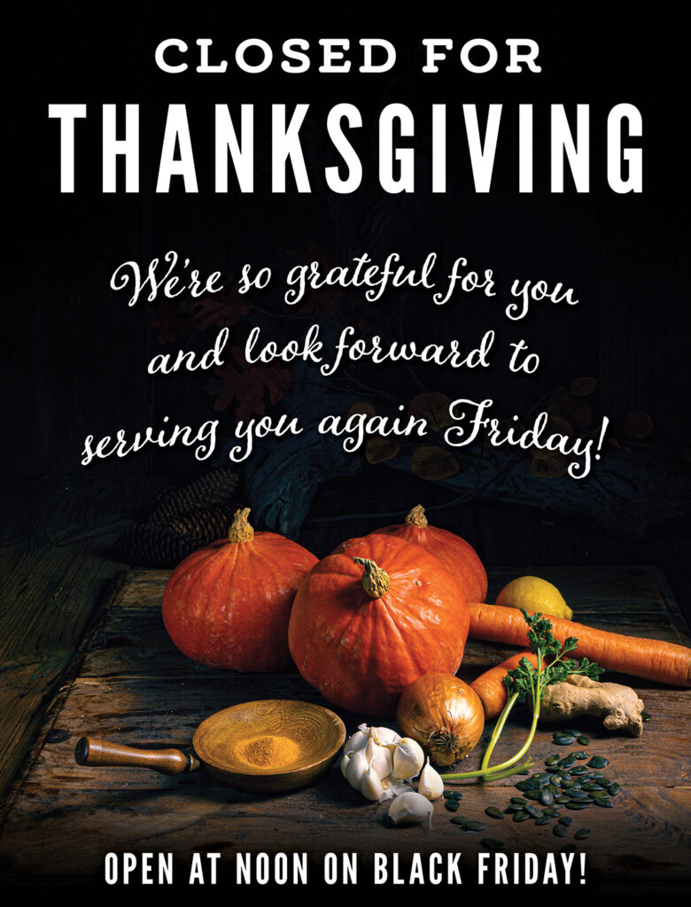 Thursday | November 27 | 12:00 AM CLOSED for THANKSGIVING Open at Noon on Black Friday! See All Events